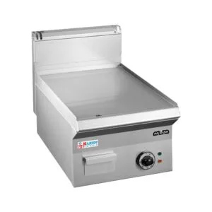 • المدى الكهربائي SMART 650؛ سطح عمل مضغوط مانع لتسرب الماء بسمك 1 مم AISI 304 S/S. ألواح تسخين سريعة التسخين مع جهاز أمان لمنع ارتفاع درجة الحرارة، مصنوعة من الحديد الزهر (قطر 220 مم) مقاومة للماء ومثبتة على سطح العمل ويتم تشغيلها بواسطة عناصر تسخين بقدرة 2,6 كيلو واط مع 6 (+1) مواضع ترموستات لتحسين الأداء التحكم في الطاقة. زوايا مستديرة وتجويف مصبوب يحبس السوائل ويمنع فيضانها، غطاء 4 شبكات 44×37