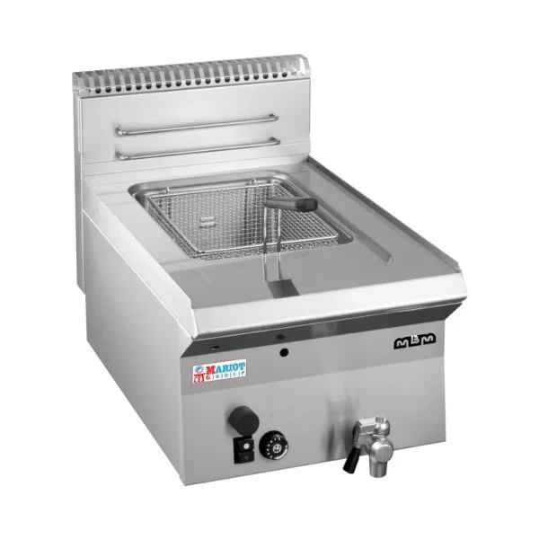 • SMART 650 fryers range consist of models w/ one; electric heating, available as top versions. Worktop is in AISI 304 18/10 S/S of 1 mm thickness; S/S tanks, moulded & w/ rounded corners; Has safety thermostat & thermostaticoil temp. regulation (90-185 °C), to keep the oil temp within safety parameters
